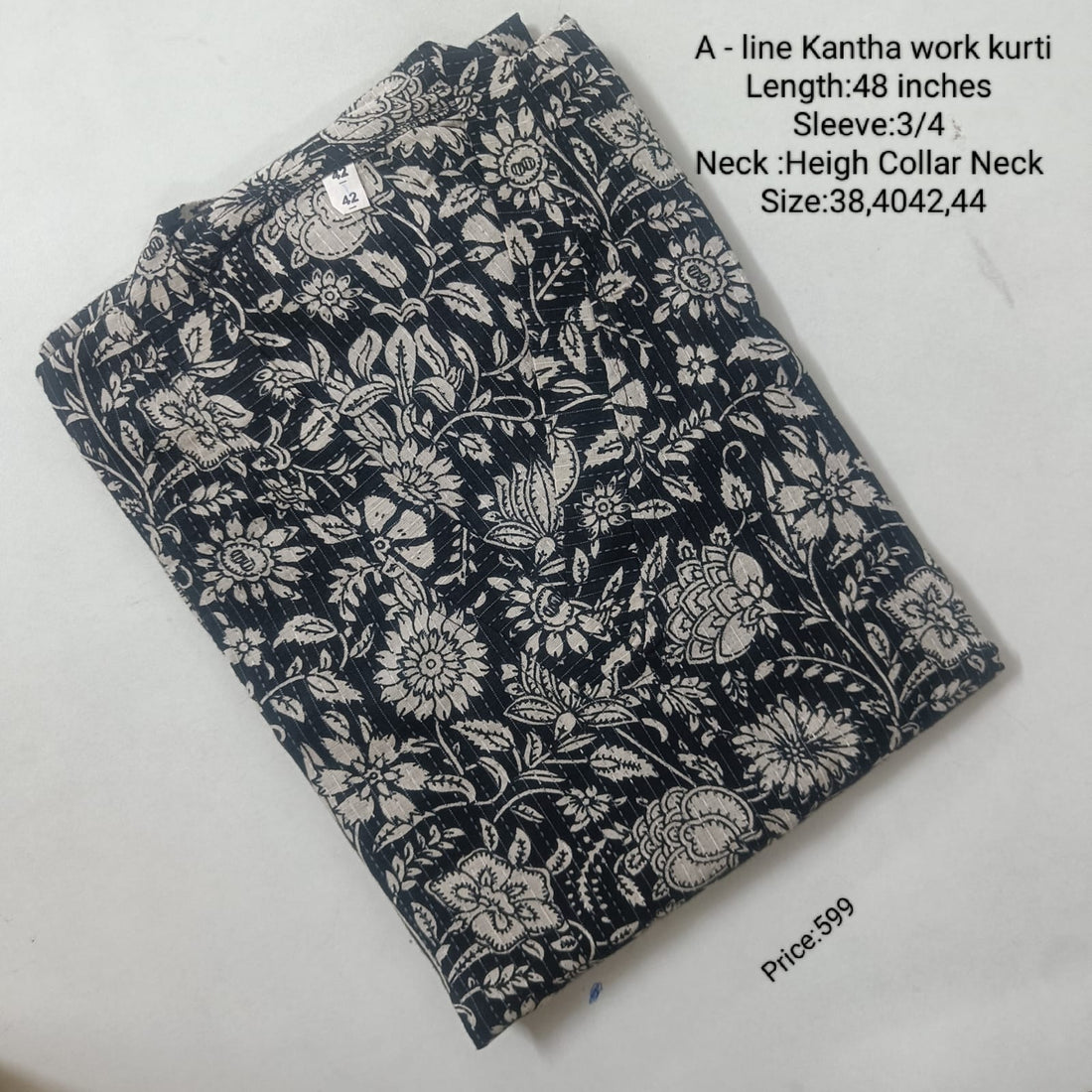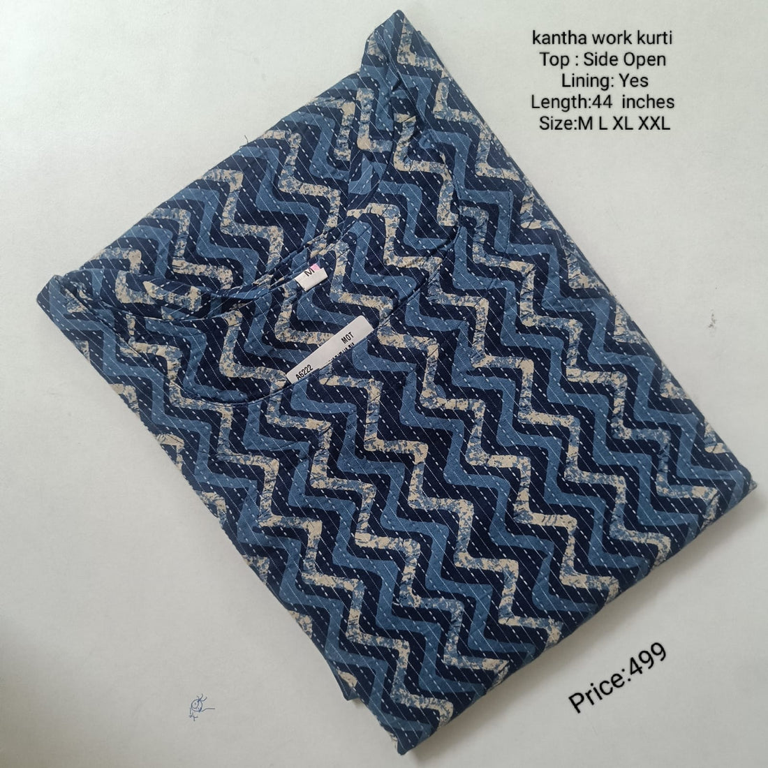 Blue Kantha Cotton Side Open Kurti With Lining - Chest to Hip Difference 2 Inches - KWK001