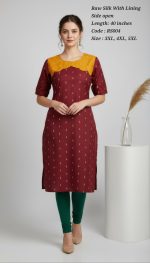 Crafted from premium raw silk, it offers a luxurious texture while the soft inner lining ensures all-day comfort. The thoughtful cut provides a 4-inch difference from chest to hip, allowing for a graceful drape and a comfortable fit that enhances your natural shape. With a classic length of 40 inches, this kurthi is ideal for both casual and semi-formal occasions.