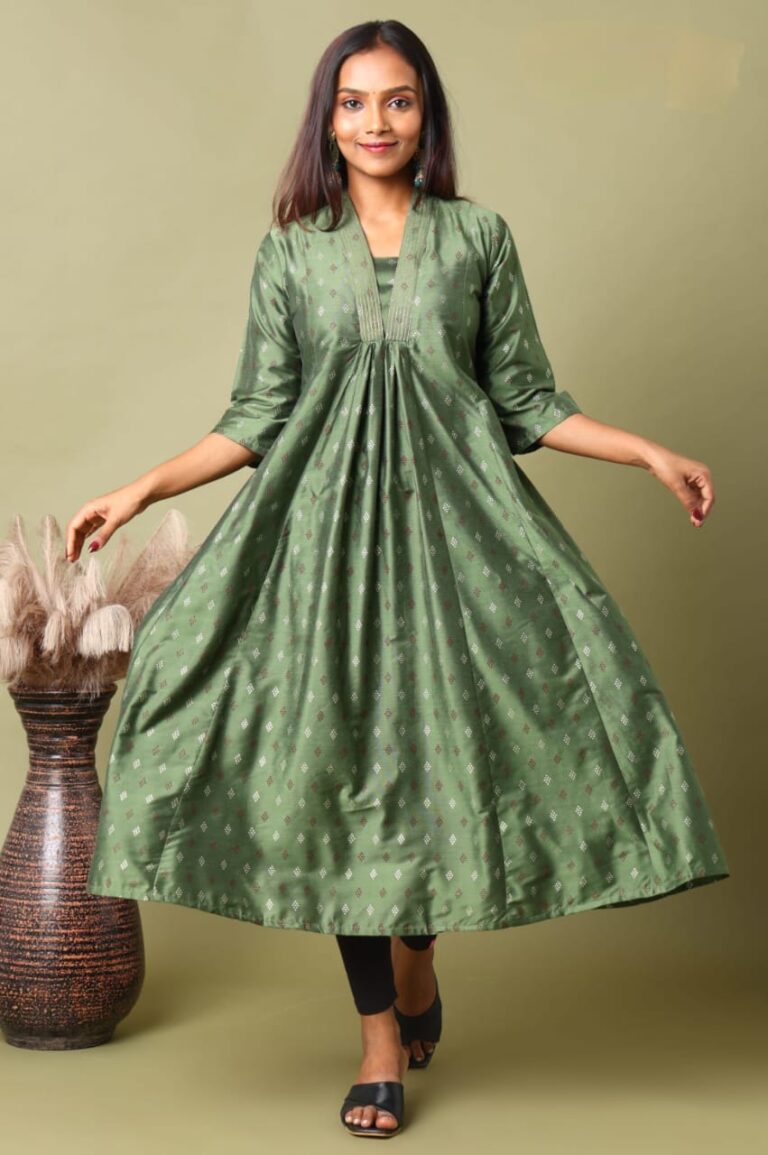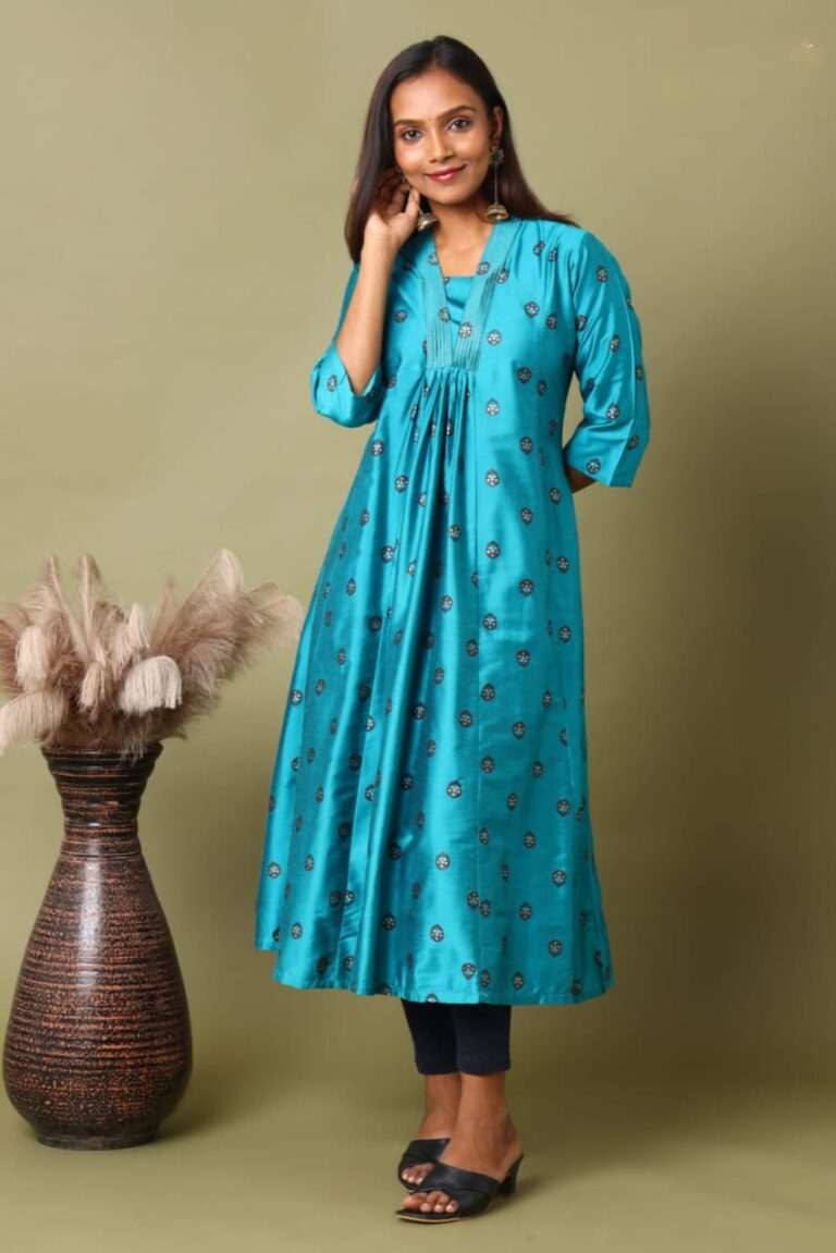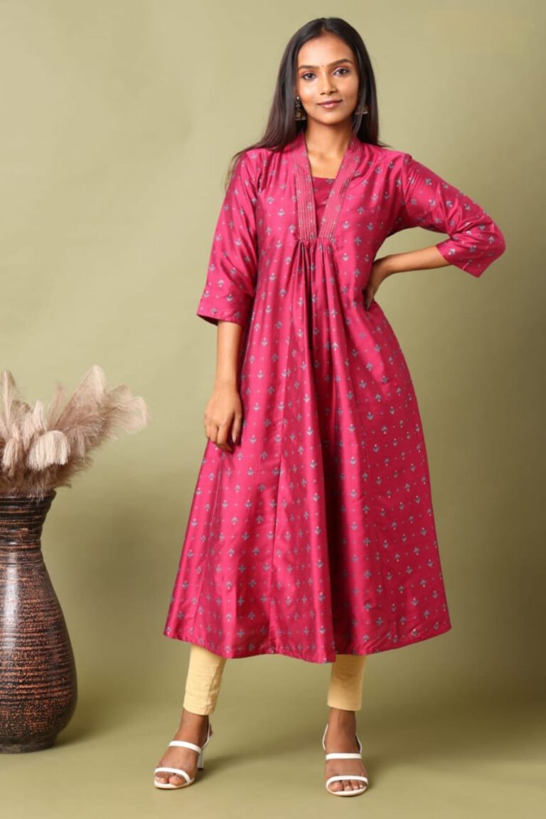 FEA004 – V Neck Silk Cotton Embroidery A-Line Kurta