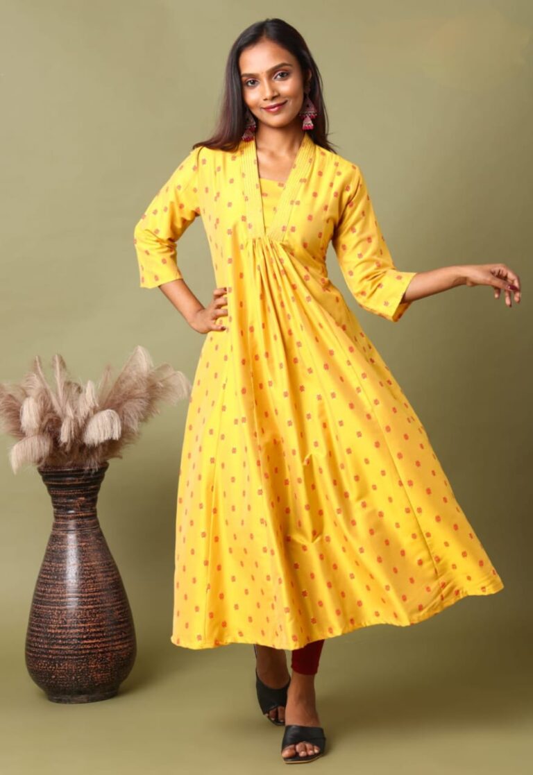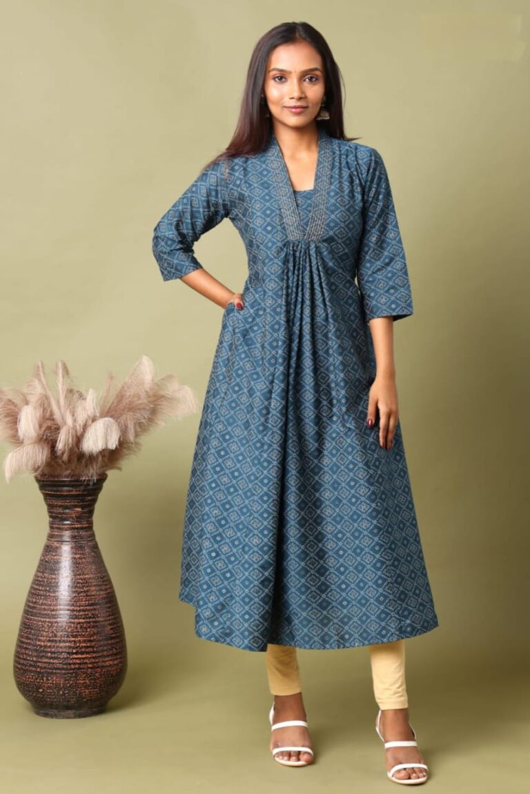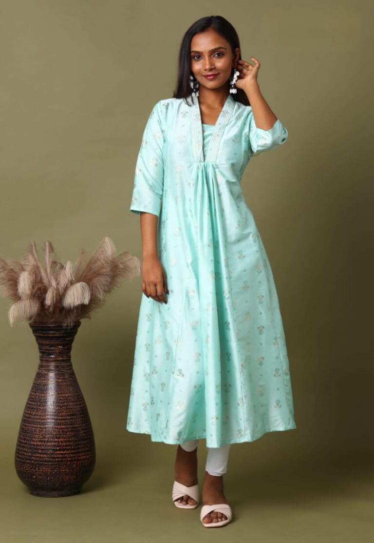 FEA001 – V Neck Silk Cotton Embroidery A-Line Kurta