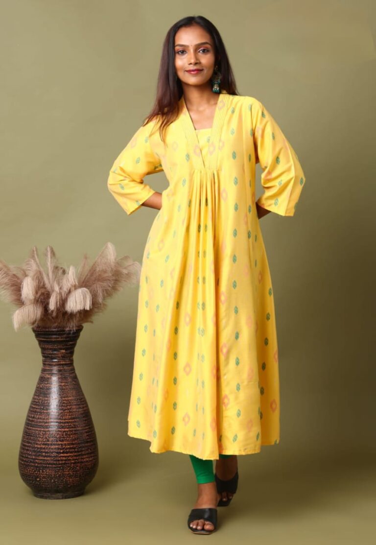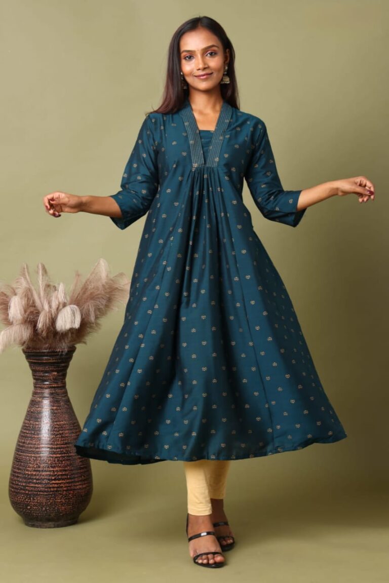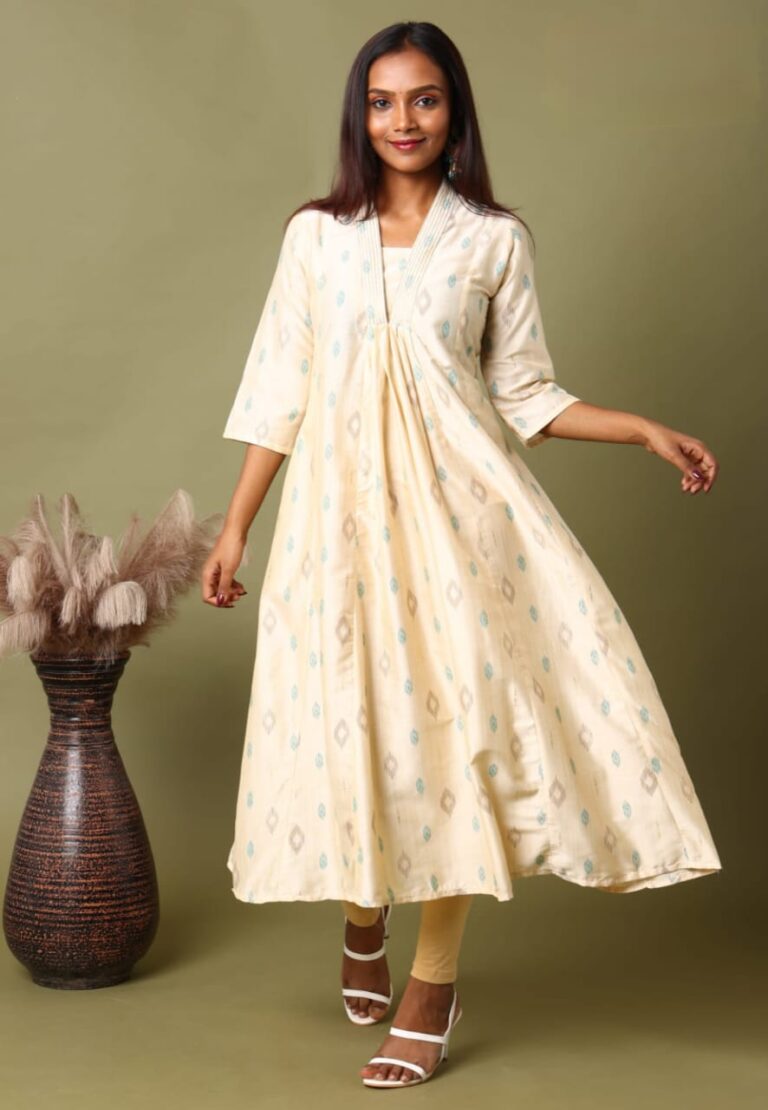 FEA007 – V Neck Silk Cotton Embroidery A-Line Kurta